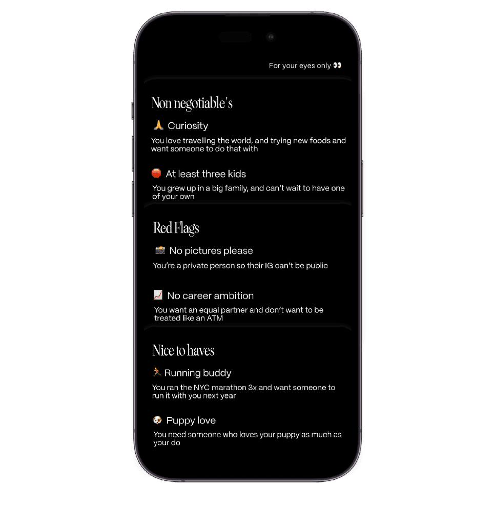 Start by telling us about yourself; your values, lifestyle, and what you're looking for. Our AI uses this data to find introductions based on compatibility, not just looks.