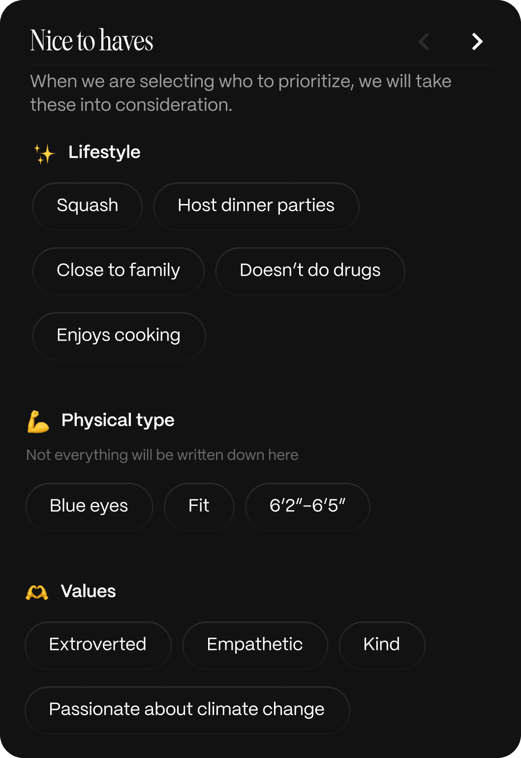 Start by telling us about yourself; your values, lifestyle, and what you're looking for. Our AI uses this data to find introductions based on compatibility, not just looks.