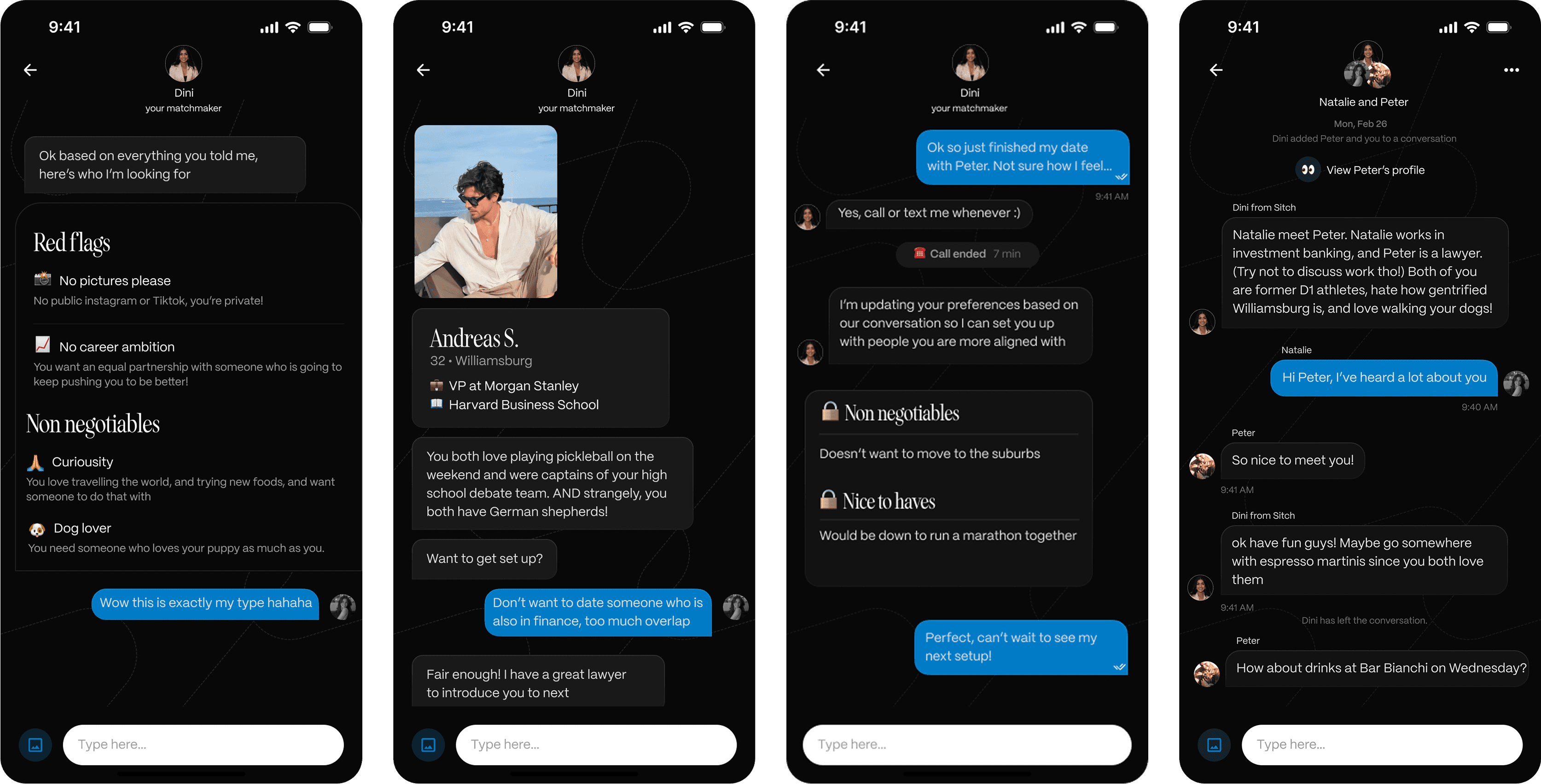Sitch is the AI-powered matchmaking app that is reimagining high intent dating. We give every user a personalized matchmaker who curates setups for you — no swiping, no penpals, and definitely no ghosting. We have a patented approach to using LLMS to replicate human matchmaking. And it really works, because our models are trained on successful, real life matchmakers.